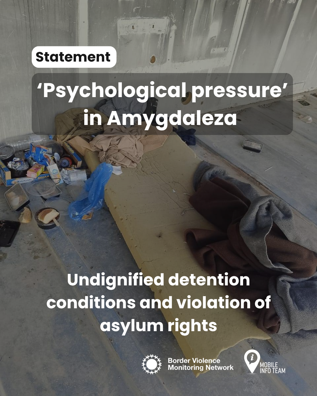 منذ 23 سبتمبر 2025، قام العديد من الأشخاص المحتجزين في مركز الاحتجاز المغلق أميغدليزا بالتواصل بشبكة مراقبة العنف على الحدود (ﺑﻲ ﻓﻲ ام ان)، حيث وصفوا ظروفًا مروعة وحالة من الارتباك بشأن أسباب ومدة احتجازهم. تؤكد هذه الشهادات التفاصيل التي نشرتها صحيفة إفسين مؤخرًا، بالإضافة إلى رسائل واردة على خطوط المساعدة التابعة للفريق المتنقل لمعلومات اللاجئين، وتضيف إلى مجموعة متزايدة من الأدلة حول تدهور الأوضاع في هذا المركز. الكثير من المحتجزين هناك تم احتجازهم لأكثر من ثلاثة أشهر بعد أن خضعوا مسبقًا لقرار تعليق طلبات اللجوء. وعلى الرغم من أنه تم توقيف هذا القرار، استمرت السلطات في تمديد فترات احتجاز العديد من الأشخاص – خصوصًا من يُعتبرون من "دول المنشأ الآمنة". ولا يزال كثير من المحتجزين غير قادرين على تقديم طلبات لجوء. بعد أن كرروا مطالبهم يوميًا لأشهر، بدأ أكثر من 30 شخصًا هذا الأسبوع إضرابًا عن الطعام. مطالبهم بسيطة: احترام حقهم في تقديم طلبات اللجوء وفي معاملة عادلة وكريمة.