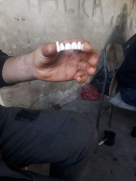“They beat you like animals. That's it. It's not human anymore.”While being beaten, the respondent lost his implant denture (see photo), when a policeman rammed his knee into his face. He also claims to have had several bruises and welts, especially on his back and upper body due to the strikes. The respondent stated that the duration of the individual beating felt like 20 minutes. Afterwards the men were allowed to put their boxers back on, shoes and remaining clothes were piled up and burned. [caption id="attachment_16096" align="aligncenter" width="450"]